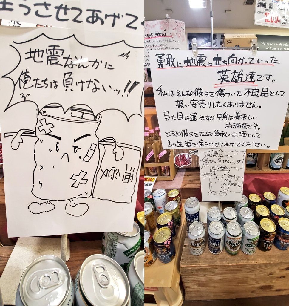 “These are the heroes who bravely stood up to the earthquake. I don’t want them to be treated like fallen and damaged products that sell at a discount. They look different but they have delicious alcohol on the inside. Please take them with you and let them live out their lives as delicious alcohol.”