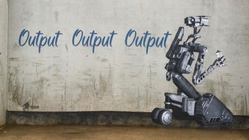 The stencil artist known as JPS recently uploaded pictures of his newest life-sized piece that features the knowledge-craving robot spreading a good word to the creative masses (albeit through an unlawful graffiti habit he obviously picked up from the NYC Los Locos gang):