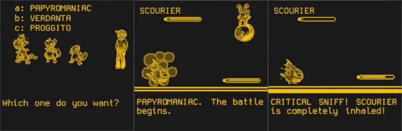 Pixel art genius Michael Mulet has constructed a game that exists entirely within a single Open Type font file. Harnessing the power of ligatures, he’s created a choose-your-own-adventure-style turn-based game that pokes fun at both Pokémon and various typeface names.