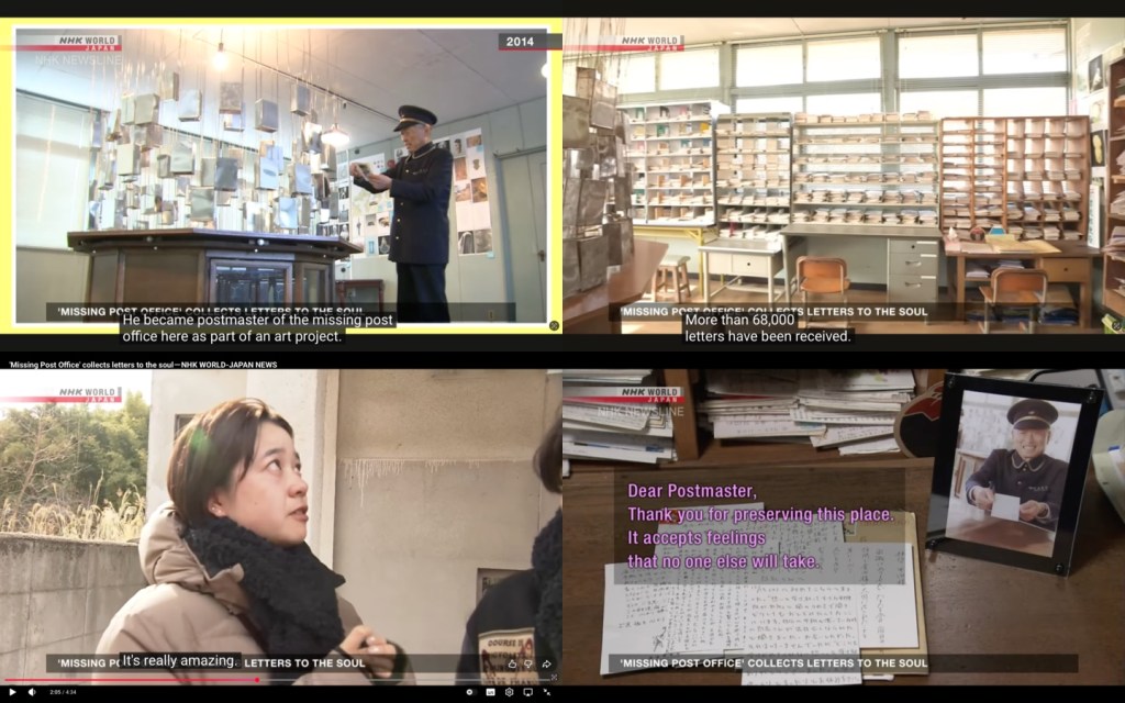 A postmaster’s son has an art project, continuing his father’s legacy in receiving undeliverable letters at the repurposed Awashima post office. Sending feelings in an exchange of words, written to loved ones no longer living, or authors who donβt yet exist in the flesh, is an appreciative idea. 68,000+ letters have been received so far.